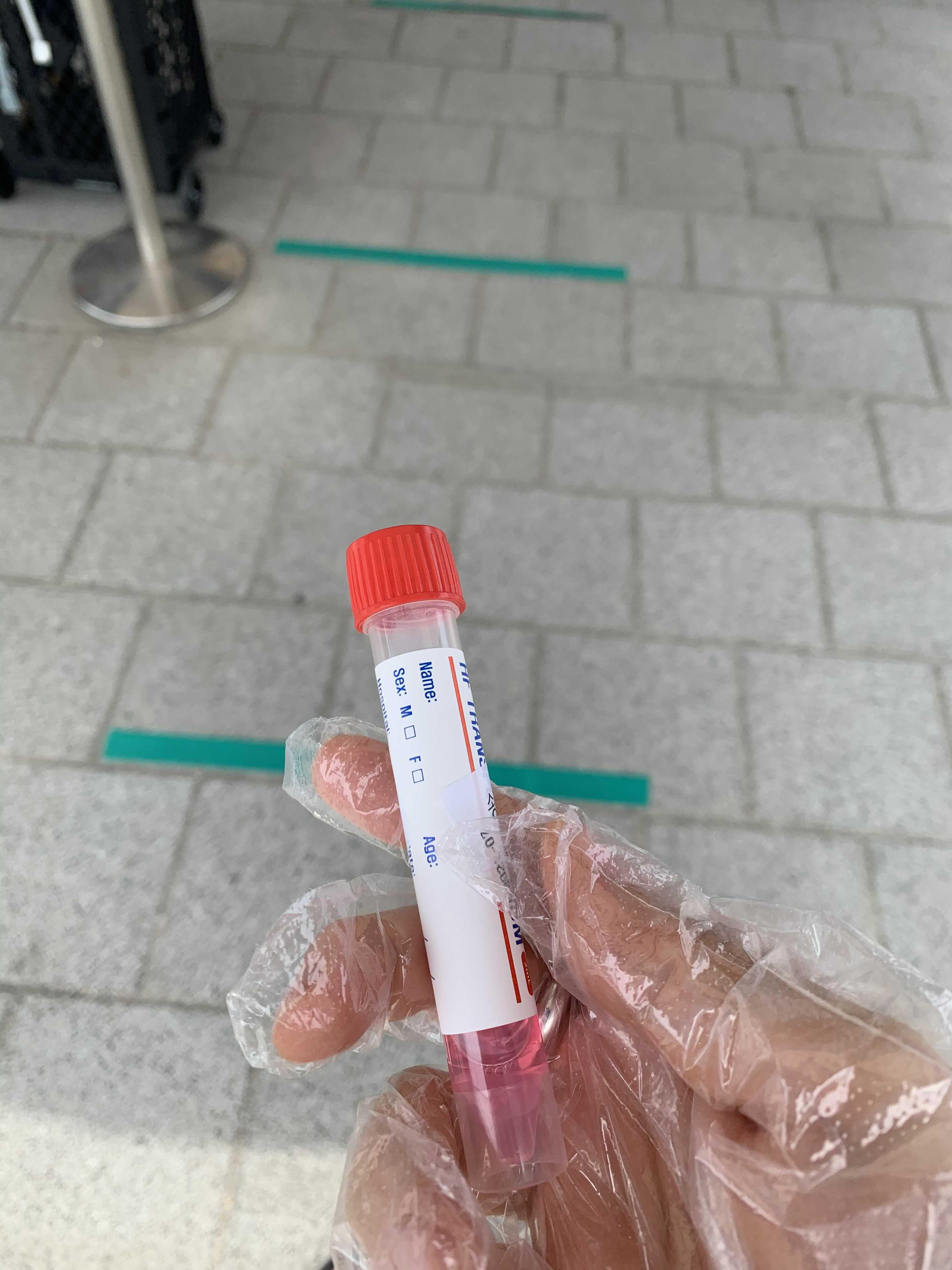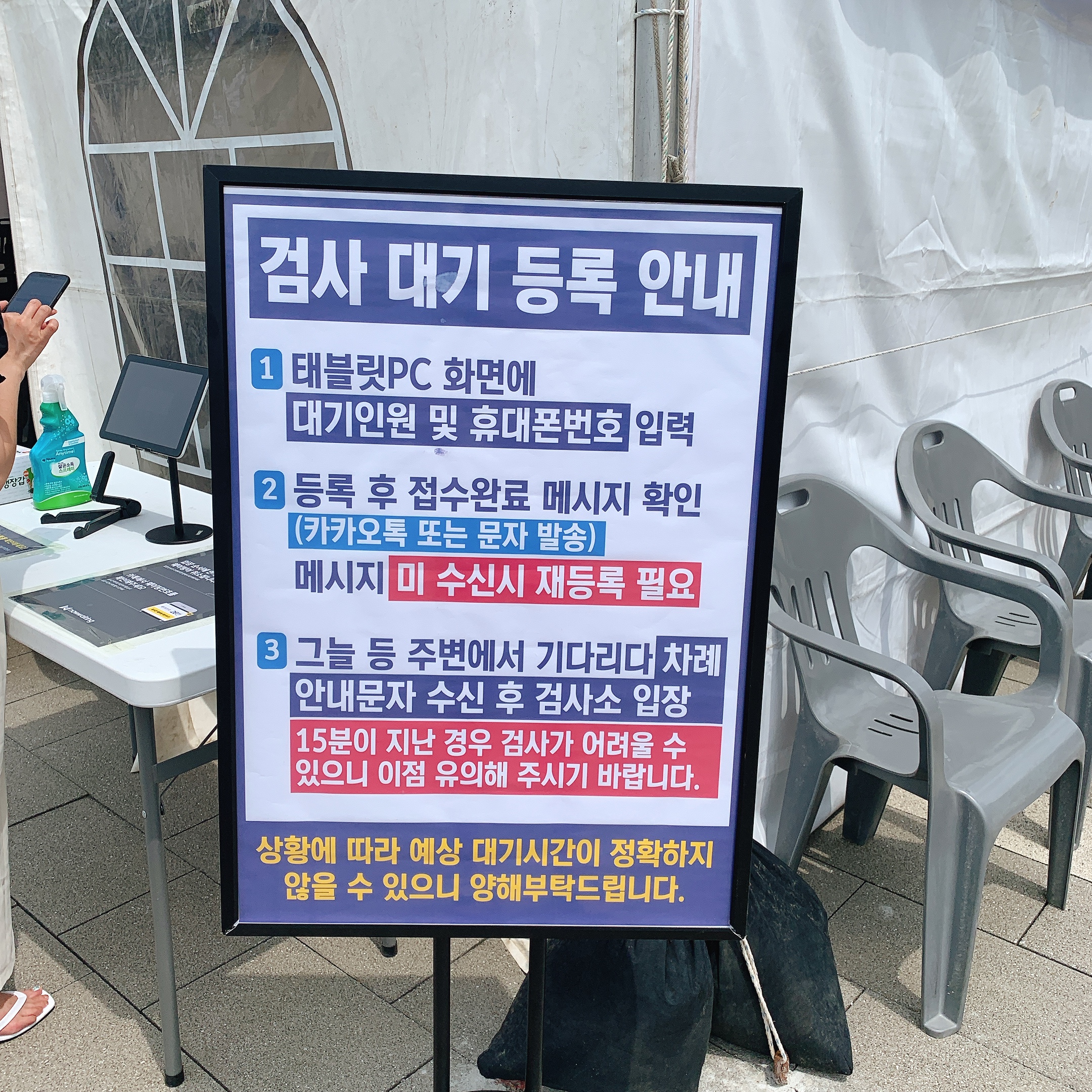손소독 > 비닐장갑 착용 > 문진표 작성(이름, 주민번호, 증상) > 액체가 담긴 병 받아서 바로 코 한번, 목 한번 쓱.